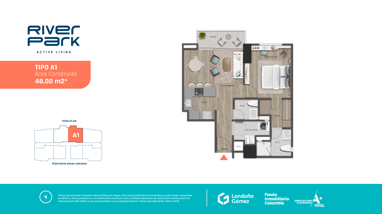 ¡Nuevo proyecto! Única torre de Apartamentos en Ciudad del Río, una ubicación estrategia que cuenta con servicios de salud, educación, transporte y comercio en El Poblado. Un proyecto consciente con áreas de 36 a 59 m2* de 1 o 2 alcobas, con completas zonas comunes inspiradas en el movimiento, dinamismo y fluidez del Río; ubicadas en el lobby, plataforma en piso 6 y rooftop en el piso 31.